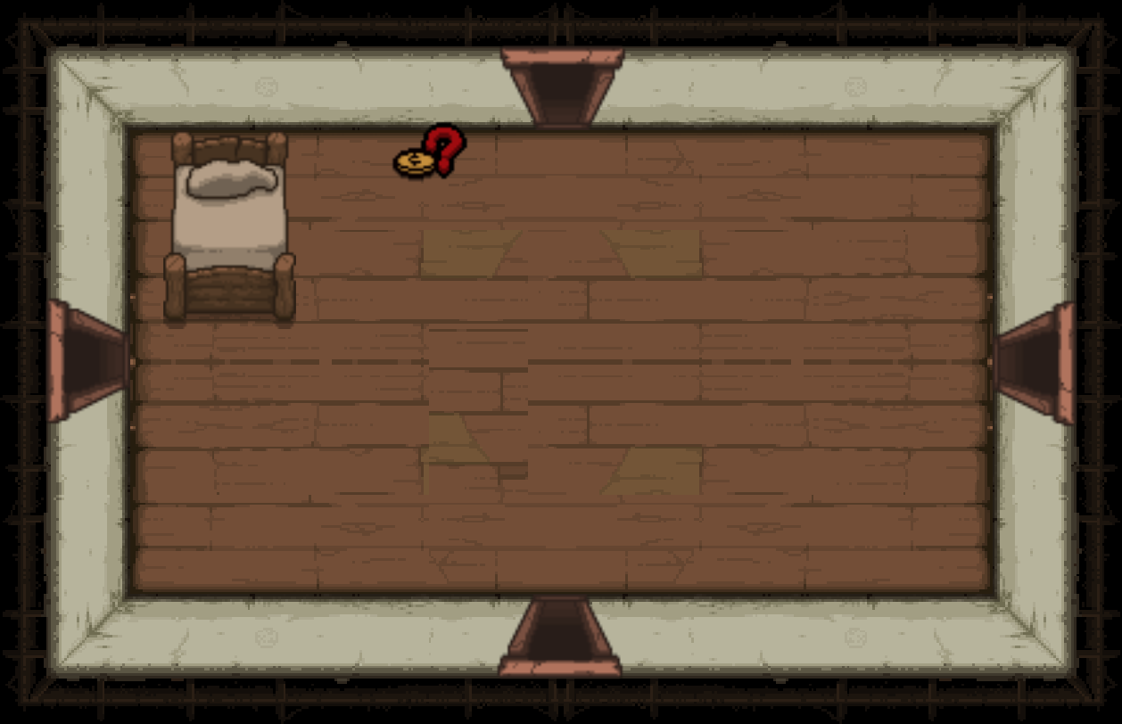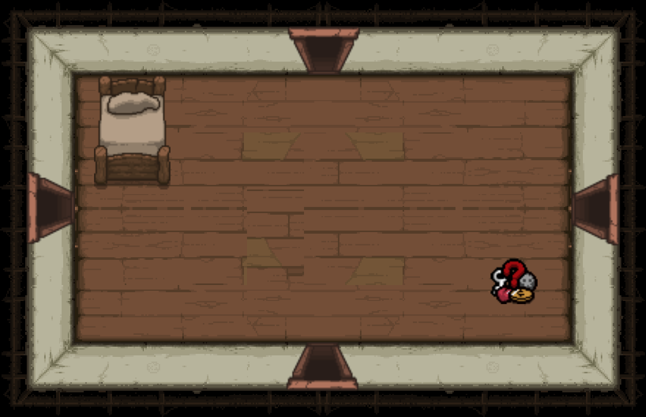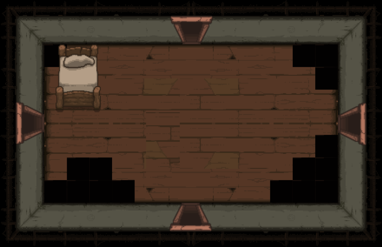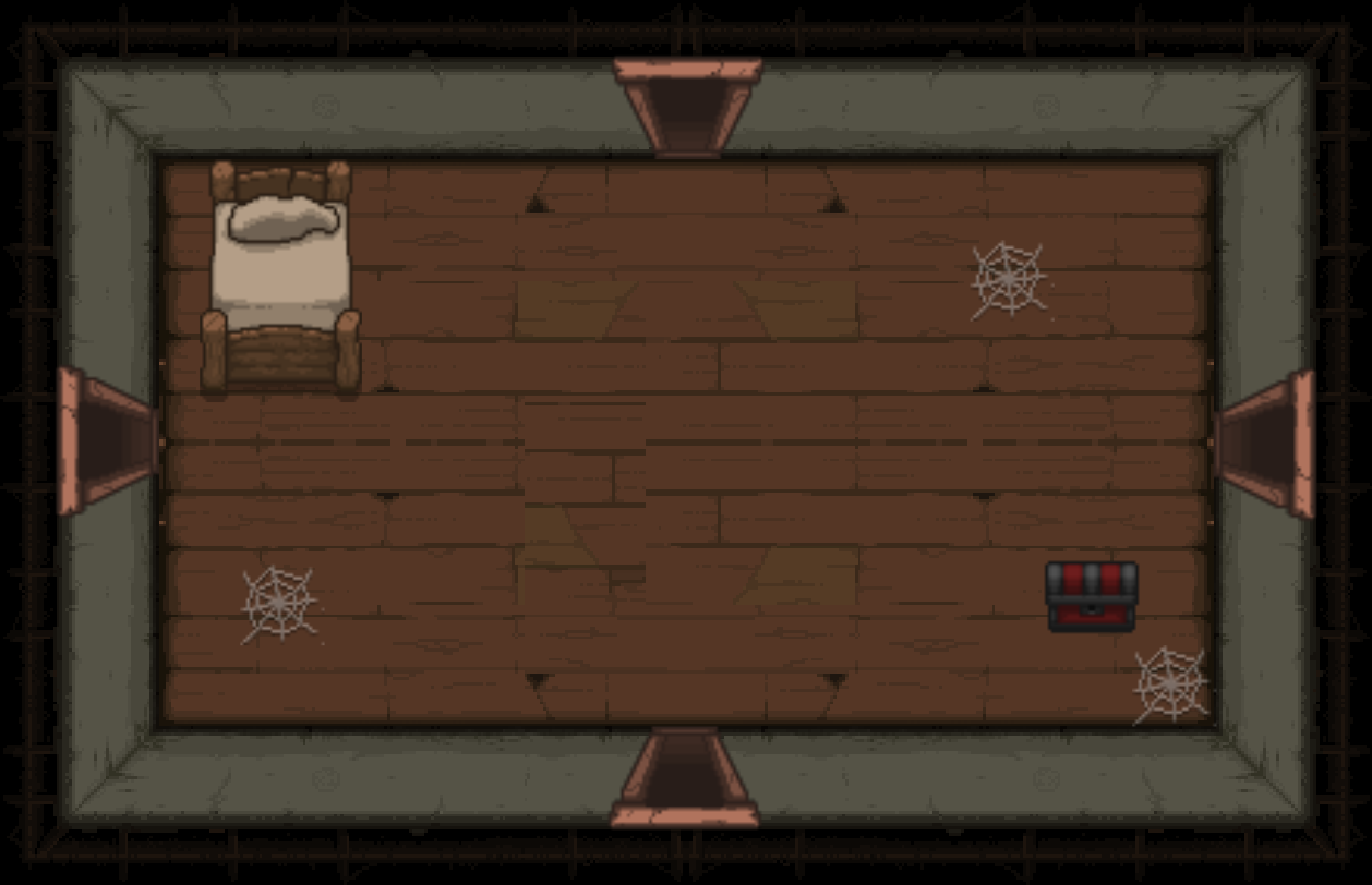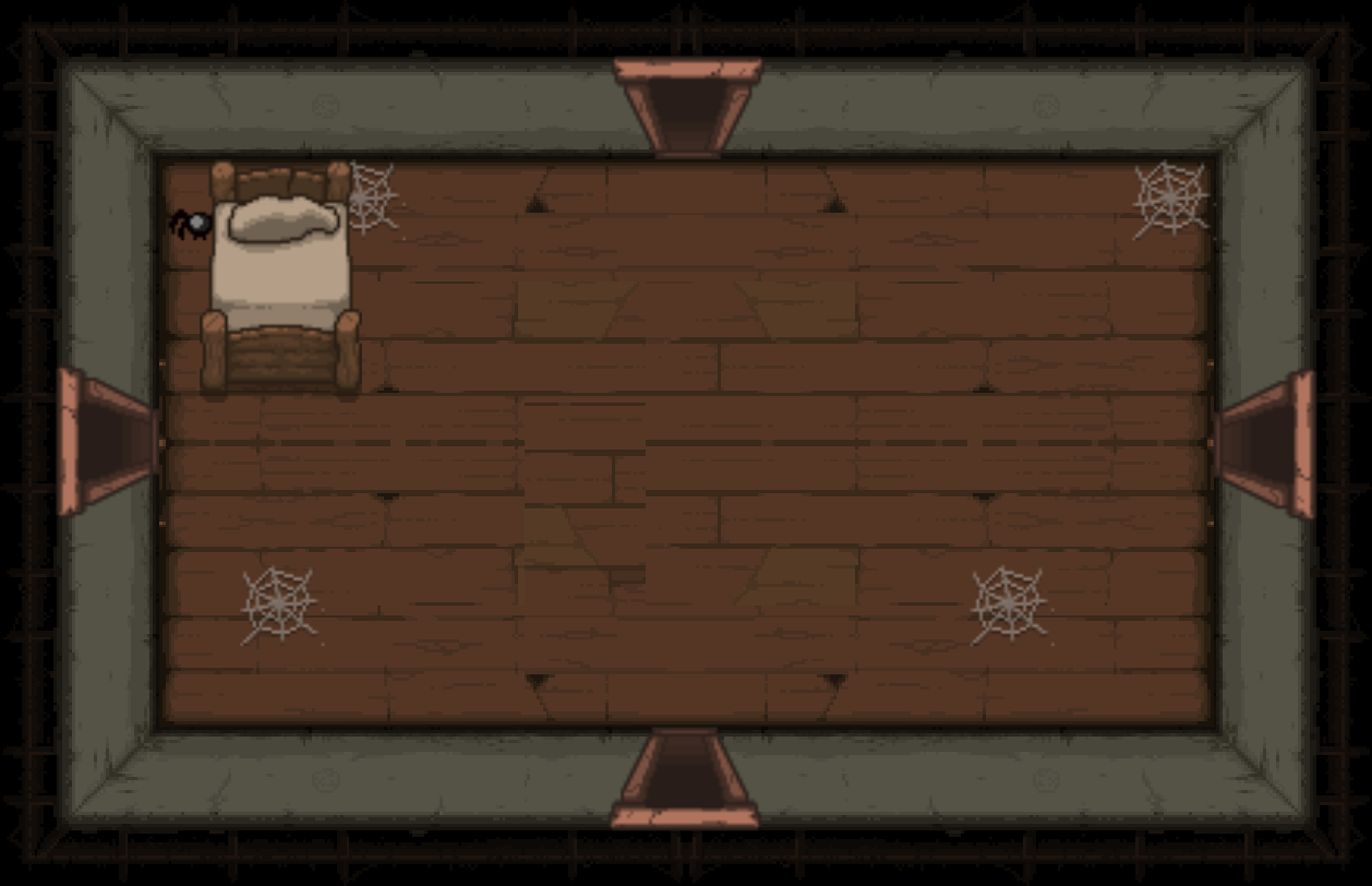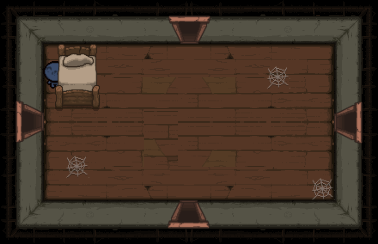 The Bedroom is a special room located behind a double plank door, requiring two bombs to open. Bedrooms can be either clean or dirty; each version has a different map icon and color scheme. It usually contains a bed and/or a carpet in the center (see gallery image 1). Isaac can sleep in the bed once to recover all Red Hearts. Bombing the carpet in the middle of the room will reveal a trap door, leading to either a Crawl Space in Clean Bedrooms, or the next floor in Dirty Bedrooms. Bedrooms are more likely to appear if Isaac has low health.
