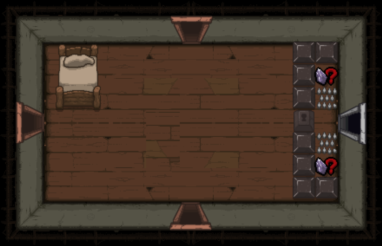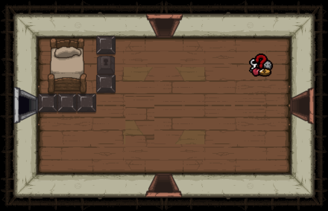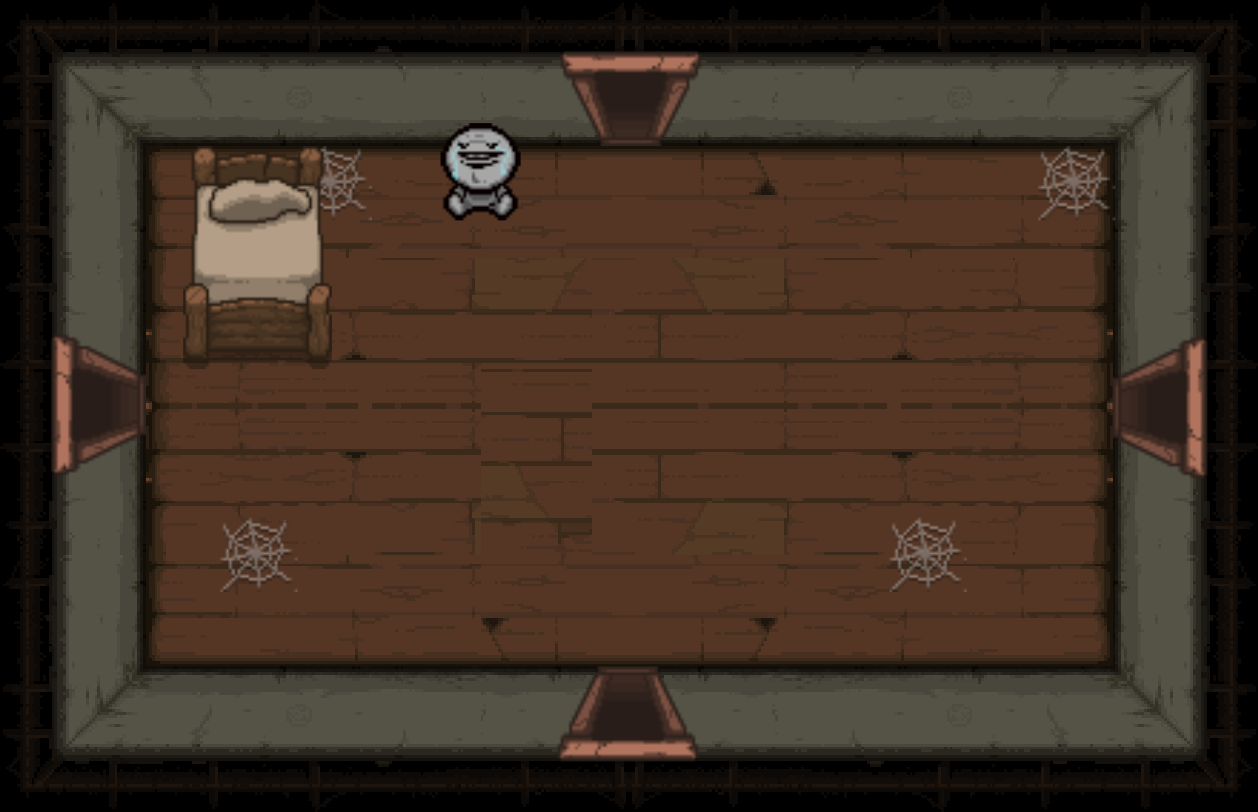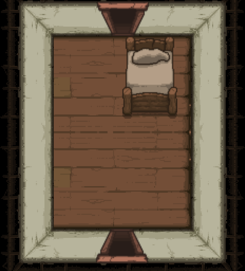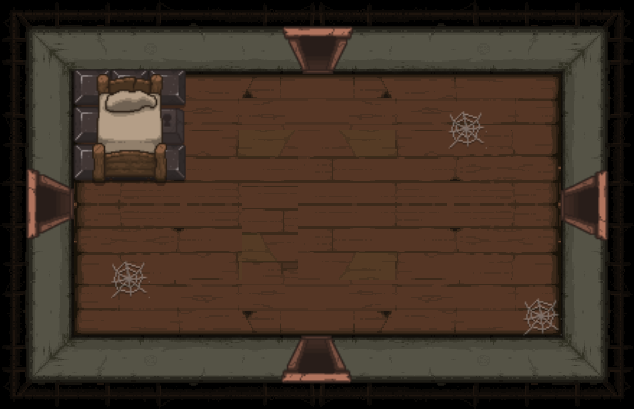 The Bedroom is a special room located behind a double plank door, requiring two bombs to open. Bedrooms can be either clean or dirty; each version has a different map icon and color scheme. It usually contains a bed and/or a carpet in the center (see gallery image 1). Isaac can sleep in the bed once to recover all Red Hearts. Bombing the carpet in the middle of the room will reveal a trap door, leading to either a Crawl Space in Clean Bedrooms, or the next floor in Dirty Bedrooms. Bedrooms are more likely to appear if Isaac has low health.