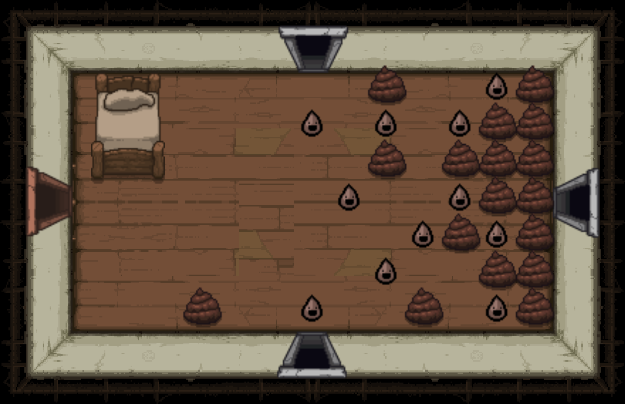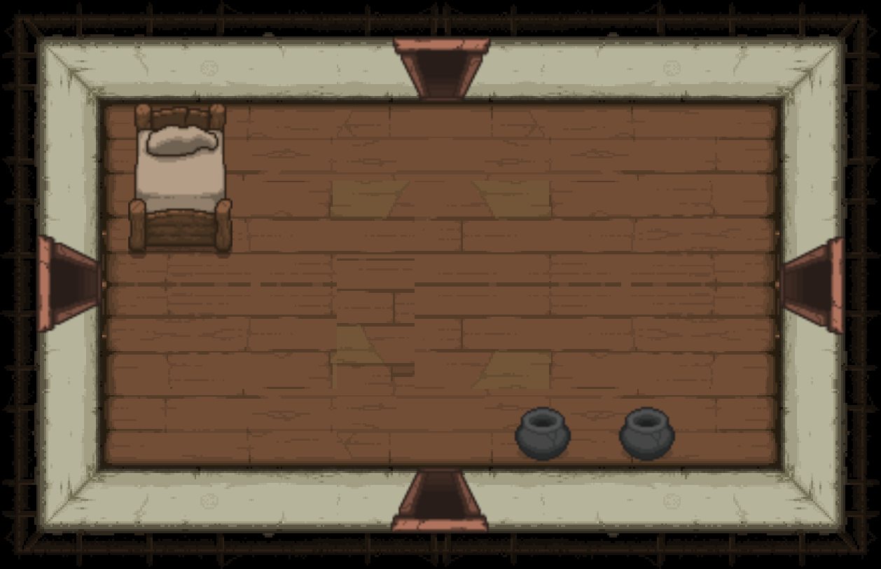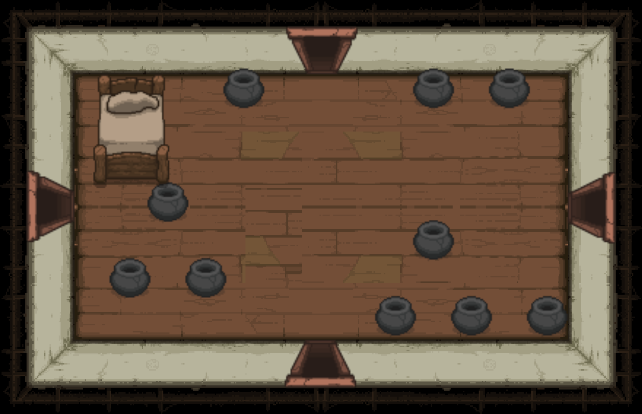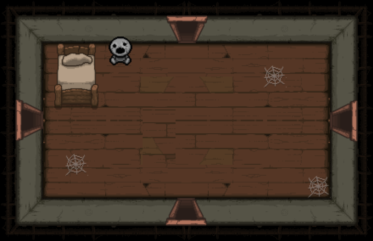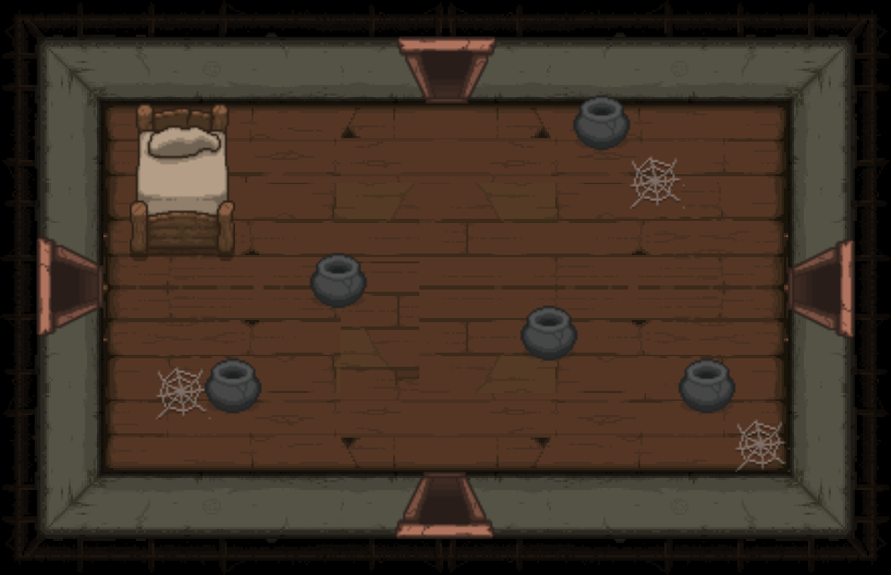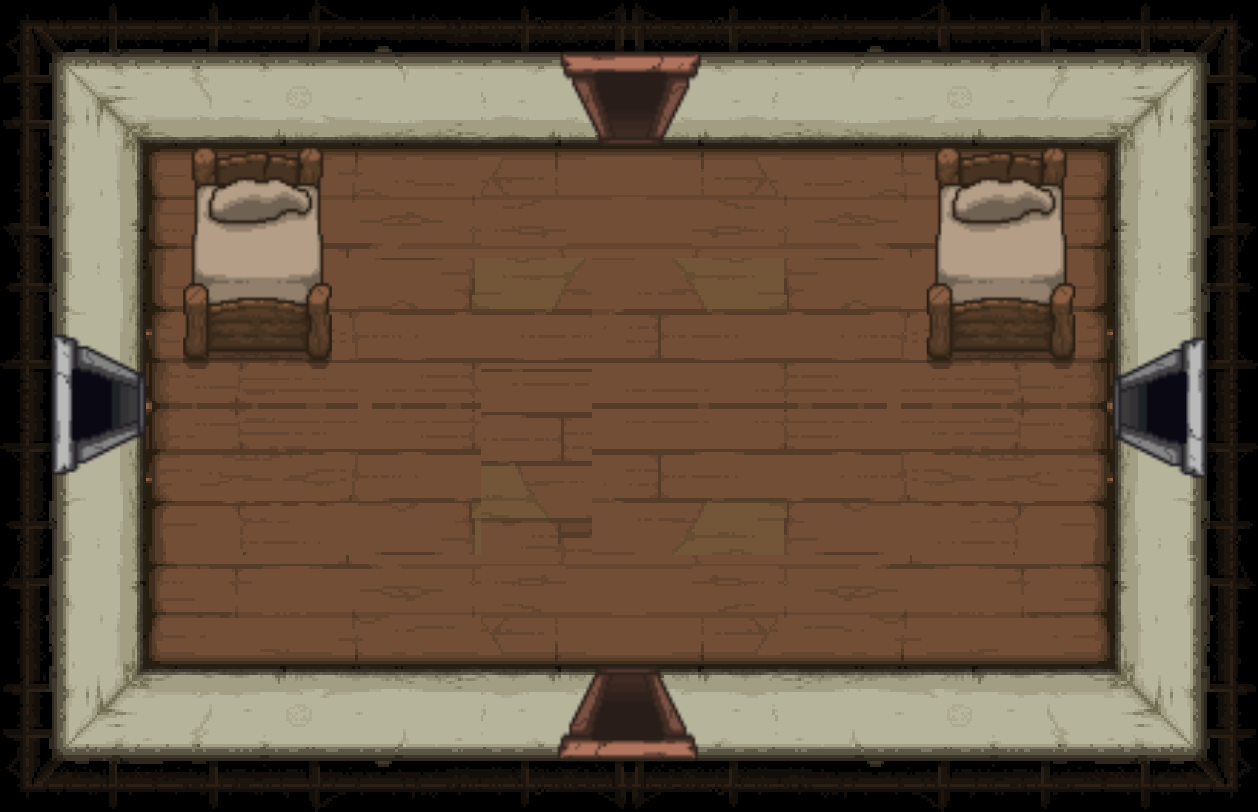 The Bedroom is a special room located behind a double plank door, requiring two bombs to open. Bedrooms can be either clean or dirty; each version has a different map icon and color scheme. It usually contains a bed and/or a carpet in the center (see gallery image 1). Isaac can sleep in the bed once to recover all Red Hearts. Bombing the carpet in the middle of the room will reveal a trap door, leading to either a Crawl Space in Clean Bedrooms, or the next floor in Dirty Bedrooms. Bedrooms are more likely to appear if Isaac has low health.