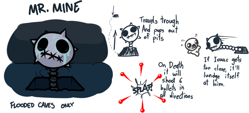 Mr. Mines are chained to pits and will attempt to launch themselves at Isaac if he comes near. They will occasionally burrow and pop up in another pit, often near Isaac. Upon death, they fire six shots in all directions.